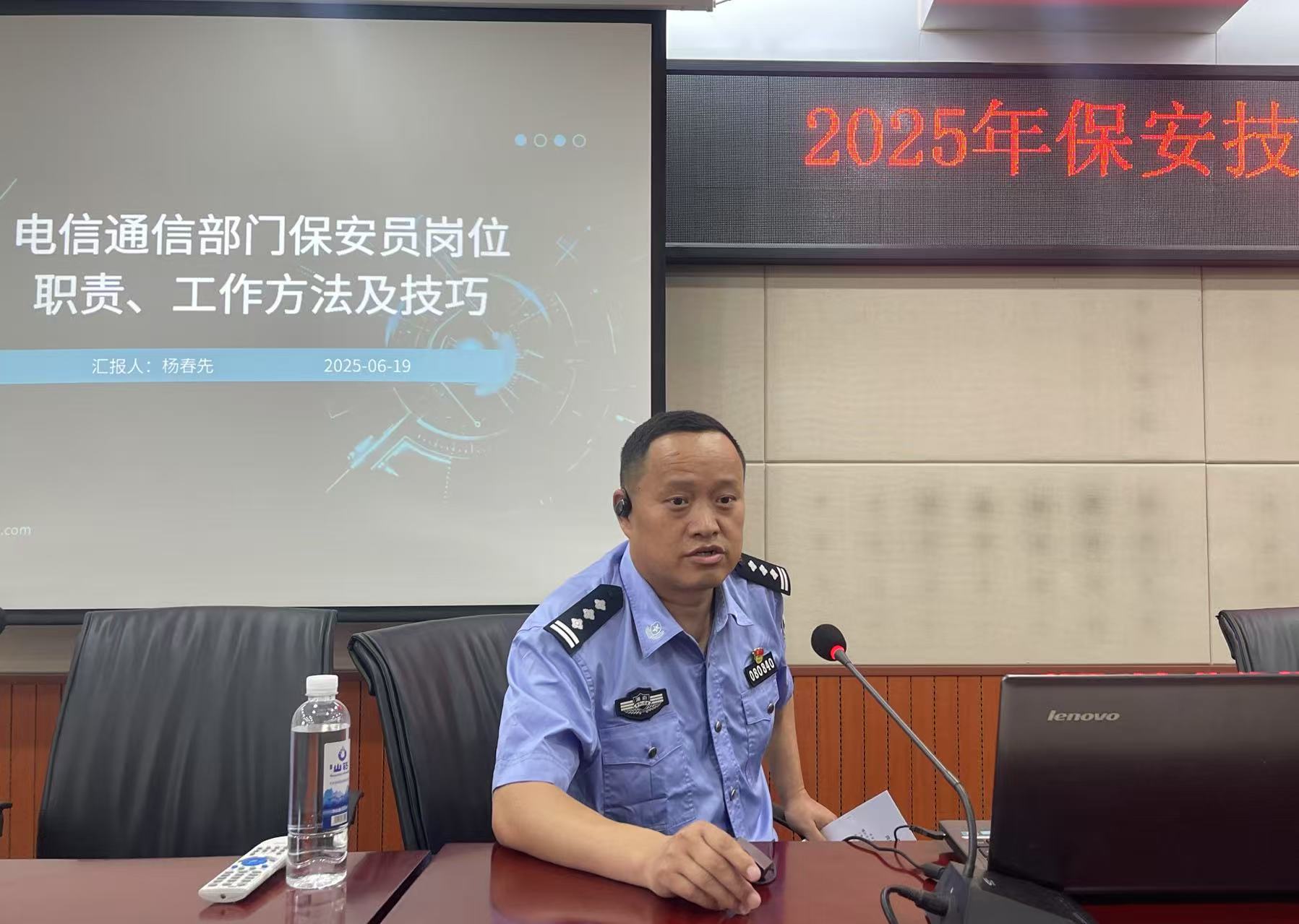 隨后,懷化市公安局鶴城分局治安大隊(duì)副大隊(duì)長(zhǎng)楊春先為保安人員帶來(lái)了一場(chǎng)精彩的專題講座。講座圍繞 “通信部門保安員崗位職責(zé)、工作方法及技巧” 展開,楊副大隊(duì)長(zhǎng)憑借豐富的實(shí)戰(zhàn)經(jīng)驗(yàn)和專業(yè)知識(shí),深入淺出地講解了通信部門安保工作的特點(diǎn)與重點(diǎn)。他從保安員的基本職責(zé)出發(fā),詳細(xì)闡述了日常巡邏、門禁管理、突發(fā)事件應(yīng)對(duì)等工作的規(guī)范流程和實(shí)用技巧,并結(jié)合實(shí)際案例,生動(dòng)地剖析了在工作中可能遇到的各種問(wèn)題及解決方法。參訓(xùn)人員認(rèn)真聆聽,仔細(xì)記錄,紛紛表示受益匪淺。