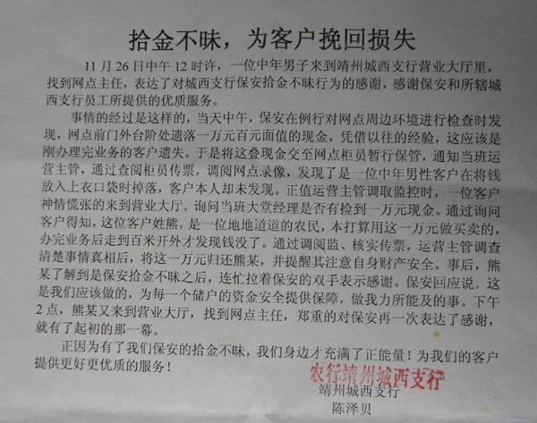 2015年11月26日中午12時許,還是金劍保安公司靖州分公司保安,在中國農(nóng)業(yè)銀行靖州城西運行值勤時發(fā)現(xiàn)銀行大門外的臺階上有一沓百元大鈔,保安當即撿了起來并立即交給了網(wǎng)點柜員清點保管。當班運營主管通過查閱柜員傳票、調(diào)閱網(wǎng)點錄像,發(fā)現(xiàn)是一位中年男性客戶所遺落。過了幾分鐘,一中年男人慌忙跑進了營業(yè)大廳,稱遺失了剛?cè)〉囊蝗f元百元大鈔,經(jīng)核對保安所拾得的鈔票正是此大意男人所遺失。