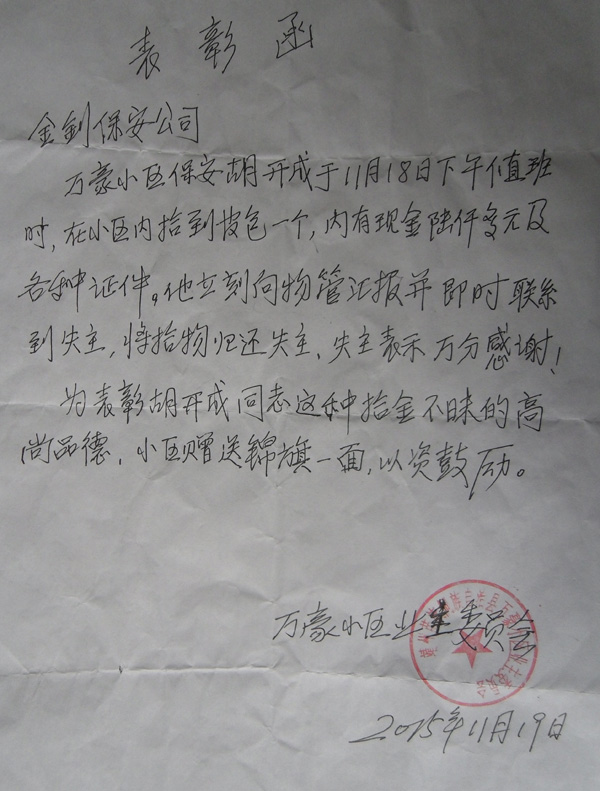 2015年11月18日下午,懷化金劍保安公司靖州分公司保安員胡開成在值班拾到皮包一個,內(nèi)有現(xiàn)金陸仟多元及各種證件。胡開成同志立即向物管匯報并及時聯(lián)系失主,將皮包交還給了失主。